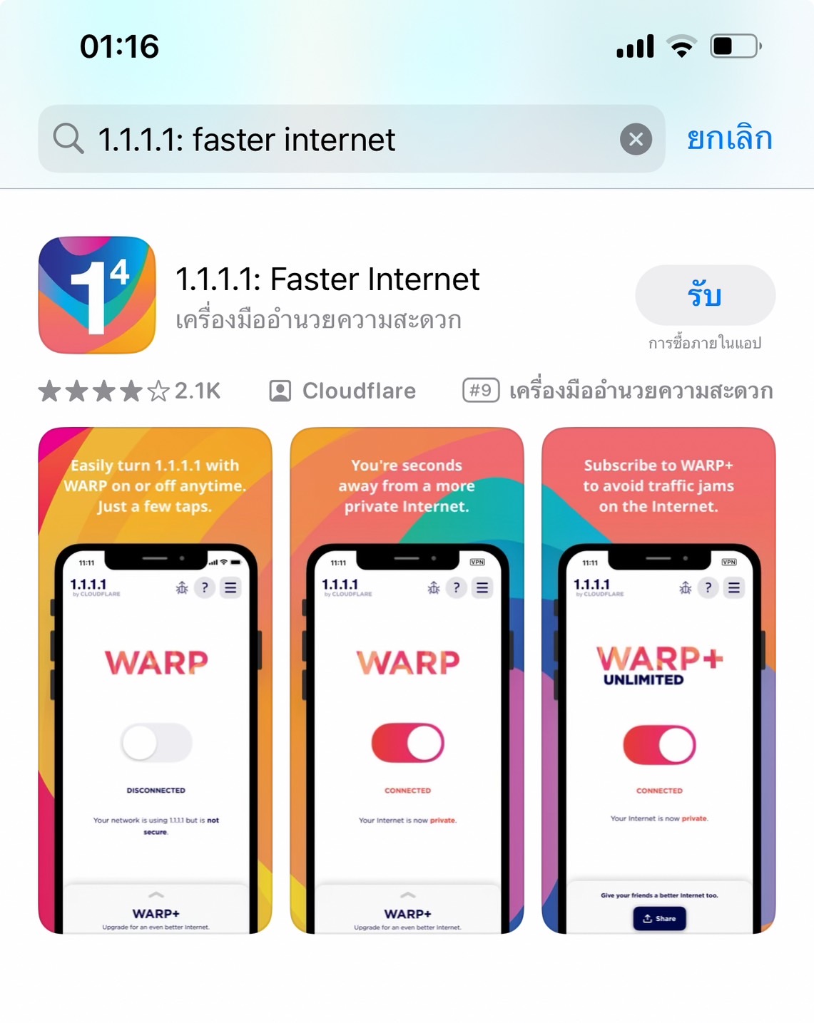 1. ไปที่ App Store แล้วดาวน์โหลดแอป ชื่อ 1.1.1.1: Faster Internet
